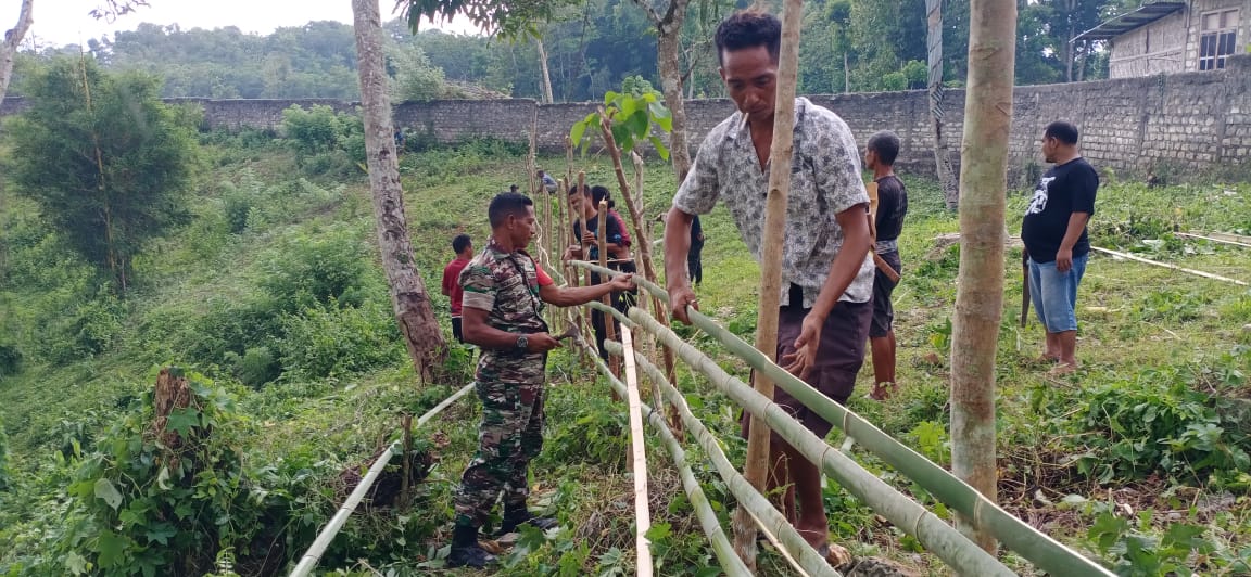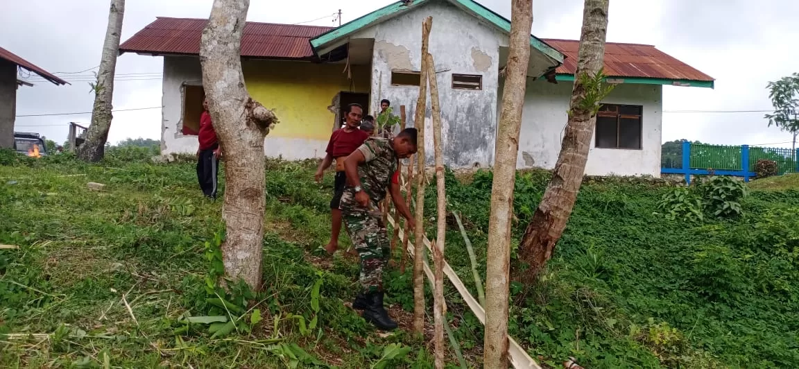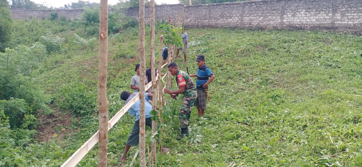 LOLI,|| Babinsa Desa Berodollu wilayah Koramil 01/Loli jajaran Kodim 1613/Sumba Barat Sertu Samuel Lede Kali bersama warga melaksanakan Kerja Bhakti membantu pembuatan Pagar Puskesmas di Desa Berodollu Kecamatan Loli Kab. Sumba Barat, Jumat (26/01/2024).