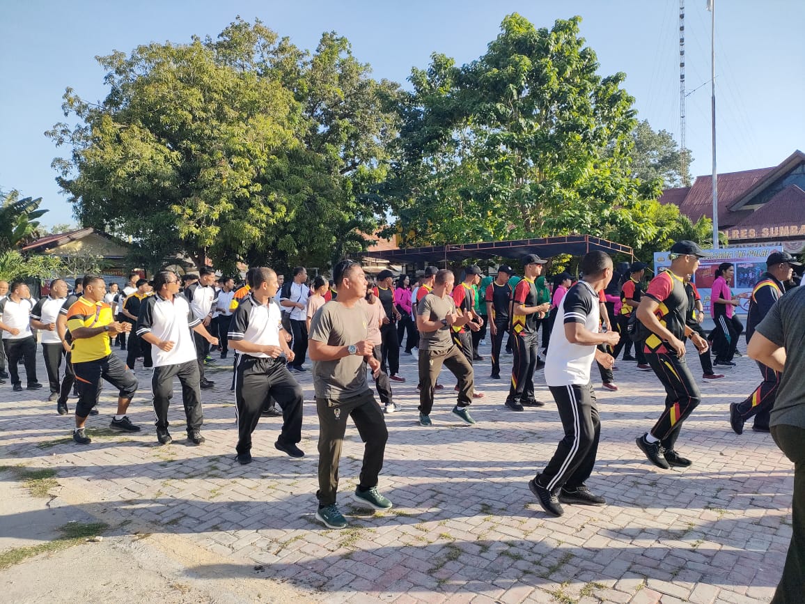 Lapangan apel Polres Sumba Timur menjadi meriah, ketika TNI Polri senam bersama, dengan iringan musik dan semangat serta sesekali canda tawa, TNI Polri seolah tiada jarak, dan akrab yang penuh kehangatan.