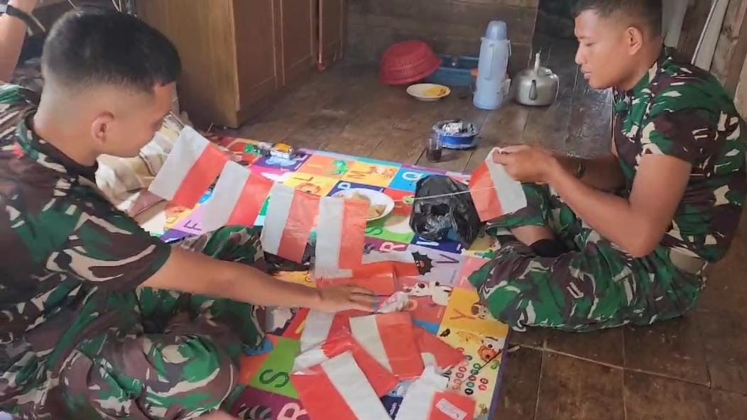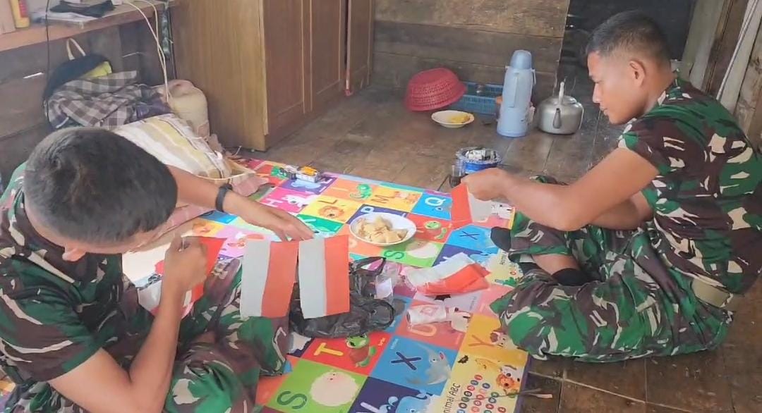 Seperti yang dilakukan oleh Serda yosep yang tergabung satgas TMMD ke 121 bersama rekan rekan saling bahu membahu membuat rangkaian bendera bendera yang nantinya dipasang di sepanjang jalan kampung Nanggorak, Senin (12/08/24).