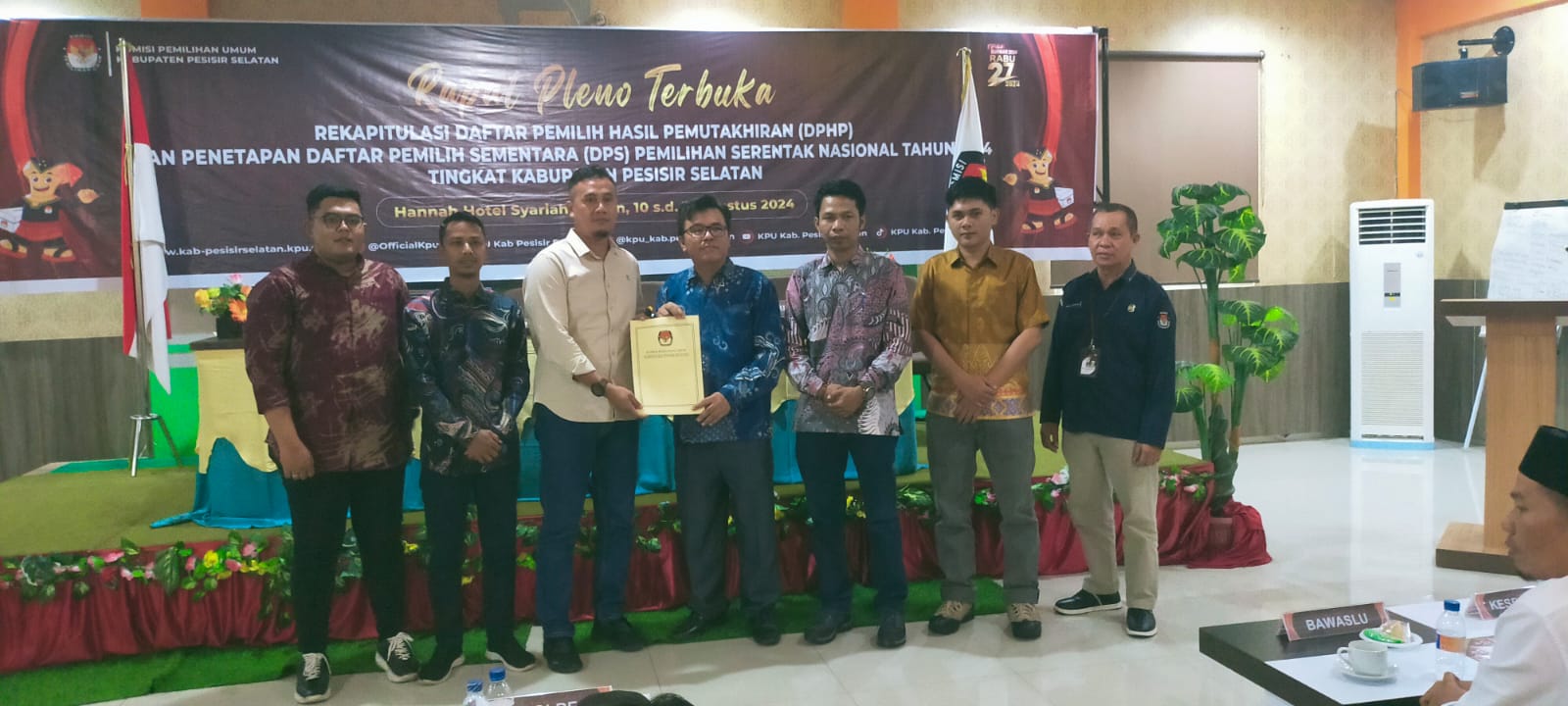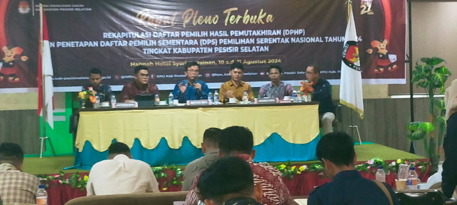 KAB. PESSEL, || Komisi Pemilihan Umum (KPU) Kabupaten Pesisir Selatan menggelar Rapat Pleno Terbuka rekapitulasi daftar pemilih hasil pemutakhiran (DPHP) dan penetapan daftar pemilih sementara (DPS) pemilihan serentak nasional tahun 2024 tingkat Kabupaten Pesisir Selatan, bertempat Hannah Hotel Syariah Painan (11/8).