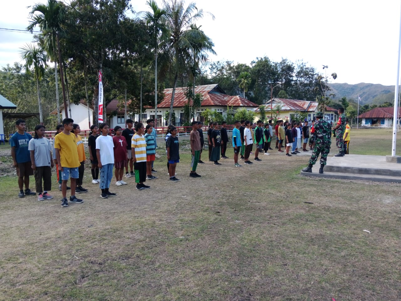TABUNDUNG, || Dalam rangka mempersiapkan pelaksanaan upacara peringatan kemerdekaan Republik Indonesia yang ke- 79 tahun 2024, Anggota Koramil 04/Tabundung, Kodim 1601/Sumba Timur Serda Ejiman bersama Praka Kuat Waluyo dan anggota Polsek berikan pelatihan PBB bertempat di lapangan SMKN 1 Tabundung ,Kecamatan Tabundung, Kabupaten Sumba Timur, Senin (12/08/2024).