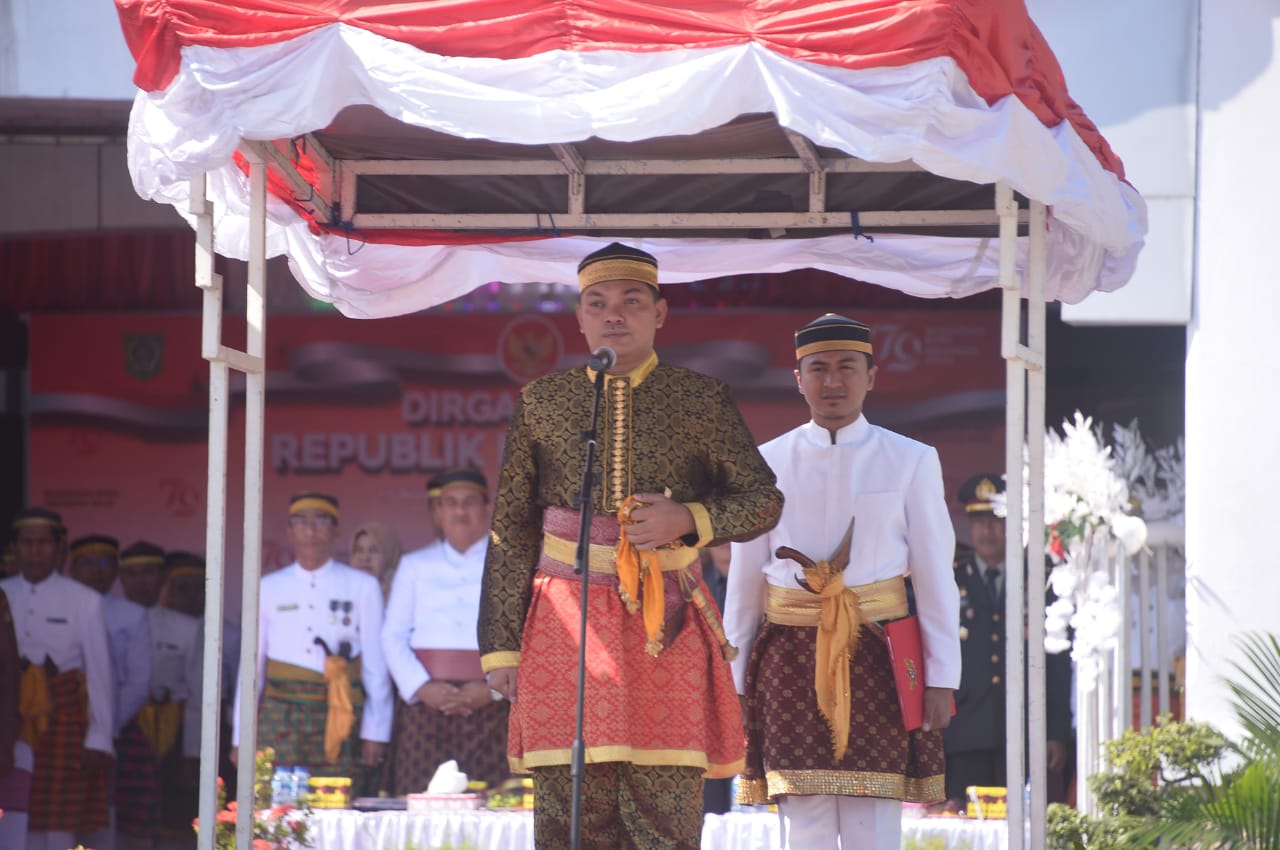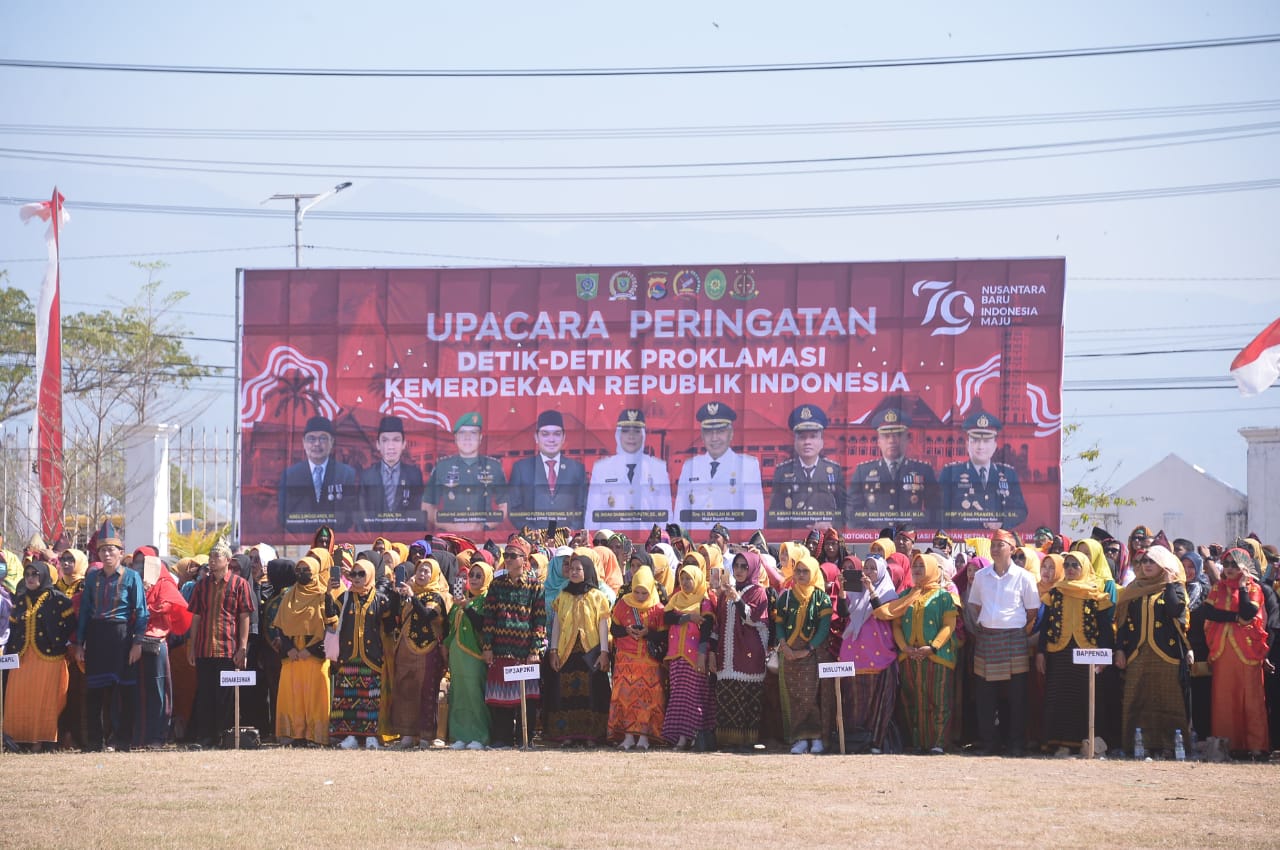 BIMA || Upacara peringatan Detik-detik Proklamasi Kemerdekaan Republik Indonesia Ke-79 Tingkat Kabupaten Bima yang berlangsung Sabtu (17/8) di Lapangan Upacara Kantor Bupati Bima berlangsung khidmat dan meriah dengan para tamu undangan dan peserta upacara yang dominan pakaian adat Bima.