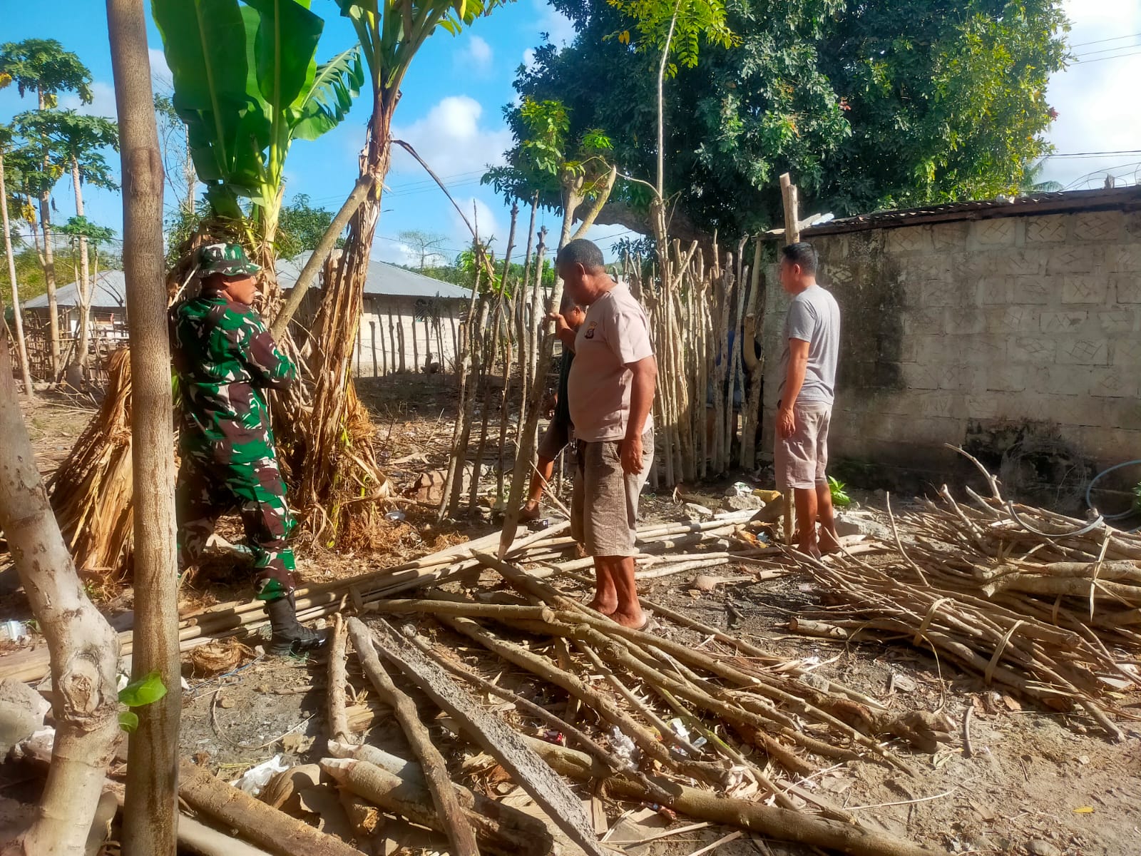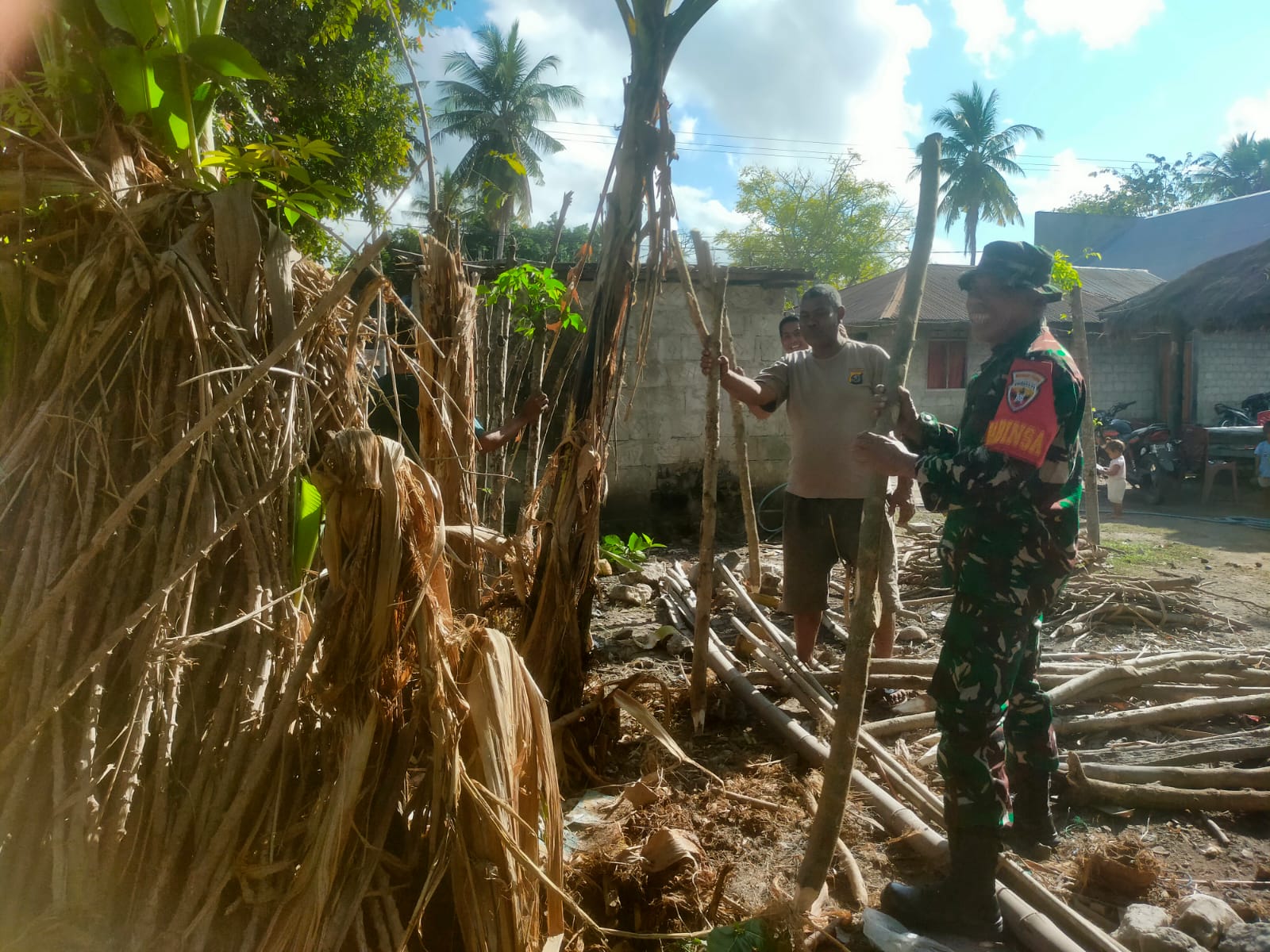 PAHUNGA LODU, || Bintara pembina desa (Babinsa) Koramil 03/Pahunga Lodu Kodim 1601/Sumba Timur Serda Hendrik Hati W, membantu salah satu warga binaannya Bapak Alvonsius Katuru yang sedang bekerja membuat pagar kebun bertempat di Desa Hadakamali, Kecamatan Wulla Waijelu, Kabupaten Sumba Timur, Sabtu (31/08/2024).