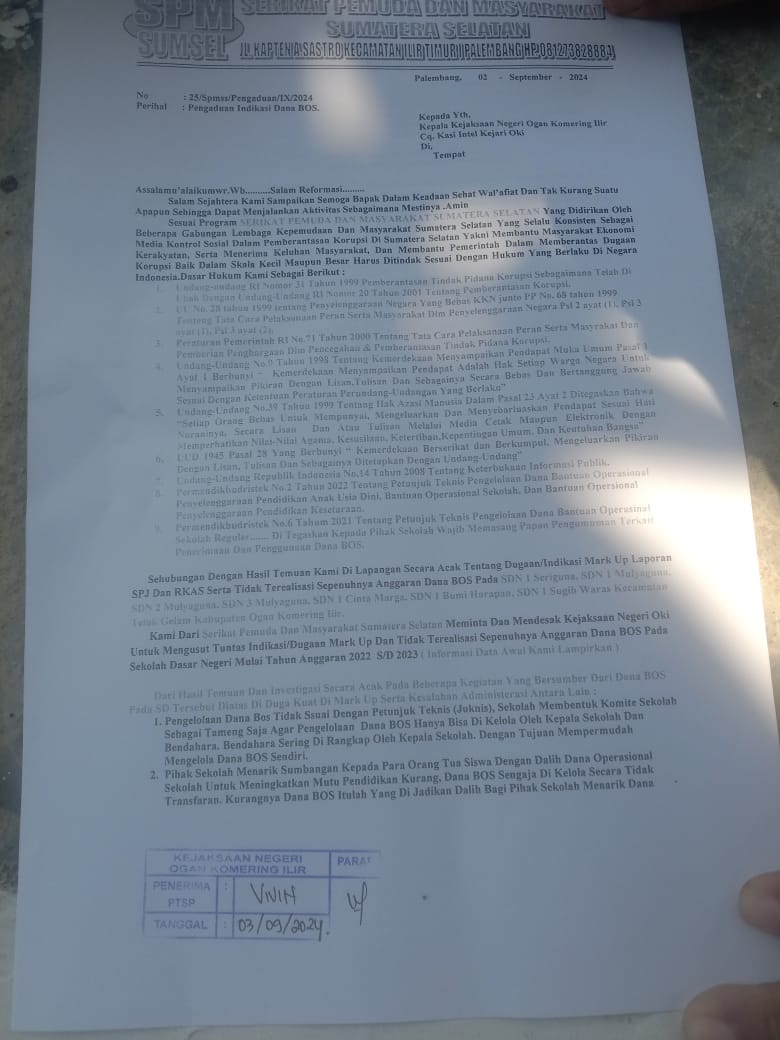 KAB. OKI, || Serikat Pemuda dan Masyarakat Sumsel (SPM) resmi melaporkan dugaan penyimpangan dana Bantuan Operasional Sekolah (BOS) di tujuh Sekolah Dasar Negeri (SDN) di Kecamatan Teluk Gelam, Kabupaten Ogan Komering Ilir (OKI) ke Kejaksaan Negeri OKI pada Senin, 03 September 2024, pukul 14:30 WIB.