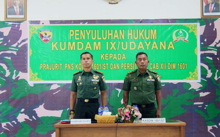Kegiatan penyuluhan hukum diberikan oleh Wakakumdam IX/Udayana, Letkol Chk RH.Lubis, SH.,MH dan dihadiri Kepala Staf Kodim 1601/Sumba Timur, Pasiter Kodim 1601/Sumba Timur,Pasi Ops Kodim 1601/Sumba Timur,Kaminvet IX-04 Waingapu,Dansubdenpom X/1-2 Waingapu, Anggota TNI dan PNS Kodim 1601/Sumba Timur, Ketua Persit KCK Cabang XlI Kodim Sumba Timur bersama Pengurus dan anggota.