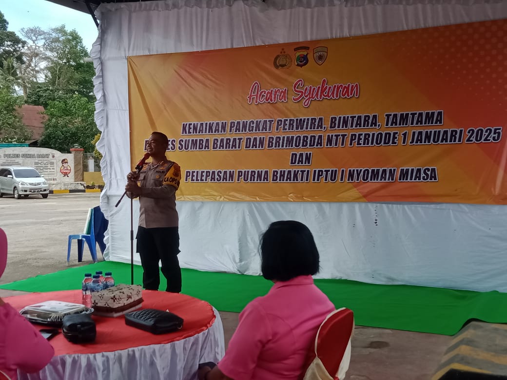 Kapolres Sumba Barat,AKBP Hendra Dotizen,S.H.,S.I.K.,M.H dalam sambutannya,Kita telah melaksanakan kegiatan yang sangat berarti yaitu salah satunya kenaikan pangkat dan kegiatan pelepasan Iptu Nyoman Miasa yang telah purna menjadi anggota Polri dan menjadi masyarakat biasa, tetapi beliau tetap bagian dari organisasi ini khususnya polres Sumba Barat khususnya lagi Polsek Katikutana.