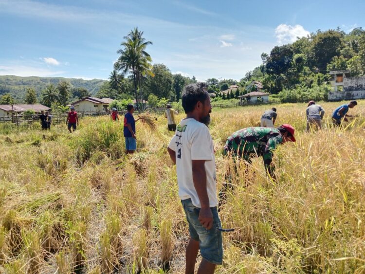 Wujud dukungan TNI khususnya Prajurit kewilayahan yaitu Babinsa dalam mendukung ketahanan pangan, dengan Semangat ikut serta terjun langsung ke sawah bantu para petani desa binaannya saat memanen padi. Inilah yang dilakukan oleh Babinsa kepada para petani warga desa binaannya.