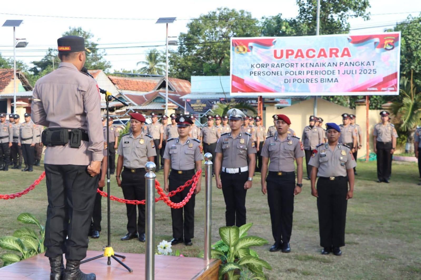 Upacara kenaikan pangkat Periode 1 Juli 2025 dipimpin oleh Kapolres Bima AKBP Eko Sutomo S.I.K.,M.I.K., Rabu 2 Juli 2025 digelar di Lapangan Apel Mapolres Bima.