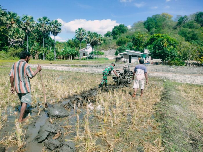 WAINGAPU, || Dalam rangka mendukung ketahanan pangan dan percepatan masa tanam, Babinsa Koramil 05/Waingapu Kodim 1601/Sumba Timur, Sertu Darusman, turun langsung mendampingi petani melakukan pembajakan sawah di Kelurahan Lambanapu, Kecamatan Kota Waingapu, Kabupaten Sumba Timur, Kamis (10/07/2025).