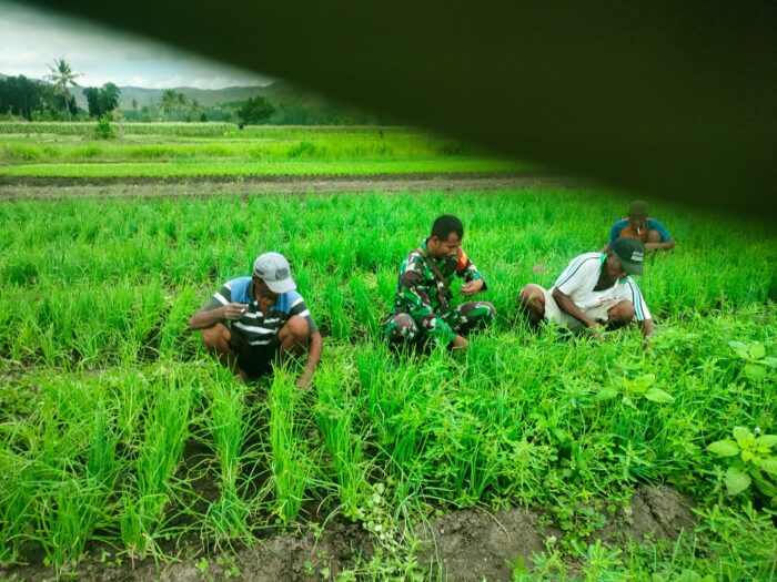 Sertu Darusman terlibat langsung di lapangan membantu proses penyiangan rumput yang tumbuh di sekitar tanaman bawang merah milik warga. Kegiatan ini tidak hanya bertujuan untuk meningkatkan hasil panen, tetapi juga mempererat kemanunggalan TNI dengan rakyat.