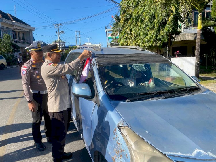 SUMBA BARAT NTT, || Dalam rangka memeriahkan Hari Kemerdekaan Republik Indonesia ke-80 yang mengusung tema “Nusantara Baru, Indonesia Maju”, Kapolres Sumba Barat AKBP Yohanis Nisa Pewali, S.S., M.H., bersama Wakapolres Kompol Made Mudana dan sejumlah Pejabat Utama (PJU) Polres Sumba Barat membagikan bendera merah putih kepada para pengguna kendaraan bermotor. Kegiatan berlangsung di depan Mapolres Sumba Barat pada Selasa (12/8/2025) pagi.