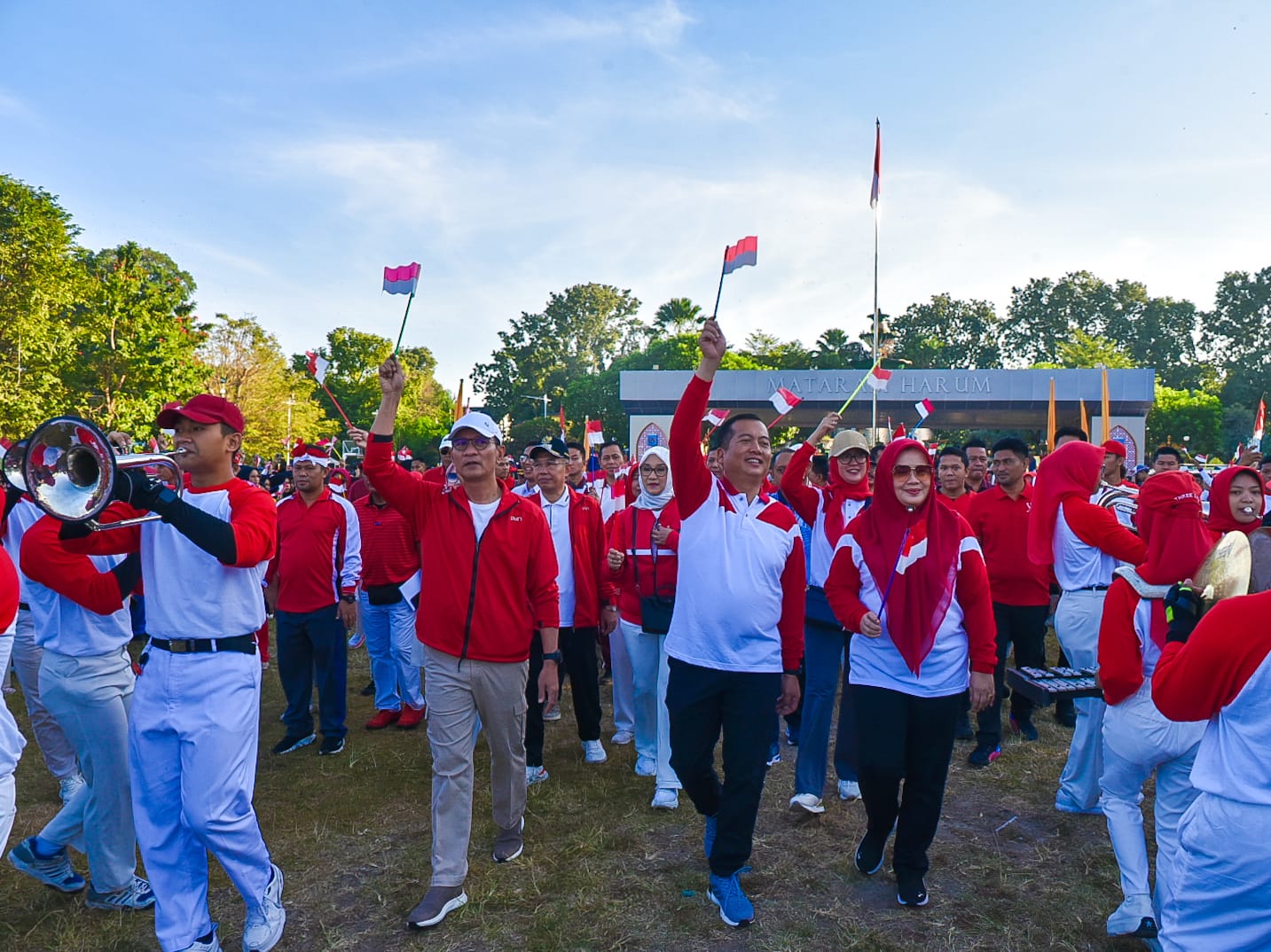 Acara tersebut dibuka langsung oleh Gubernur NTB Dr. H. Lalu Muhamad Iqbal di Taman Sangkareang. Miq Iqbal didampingi Wakil Gubernur NTB dan jajaran Pemerintahan Provinsi NTB berjalan bersama ribuan peserta berpakaian merah putih ke Teras Udaya Kota Mataram. Para peserta terdiri dari siswa-siswi sekolah se-Kota Mataram dan para ASN lingkup Pemprov NTB.