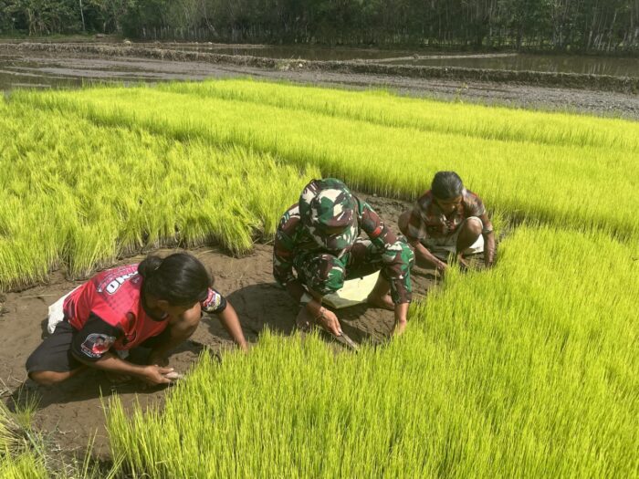 KARERA, || Babinsa Koramil 06/Karera, Kodim 1601/Sumba Timur, Pratu Aldith Umar, turun langsung membantu petani mencabut bibit padi di Desa Nggongi, Kecamatan Karera, Kabupaten Sumba Timur, Senin (18/8/2025).