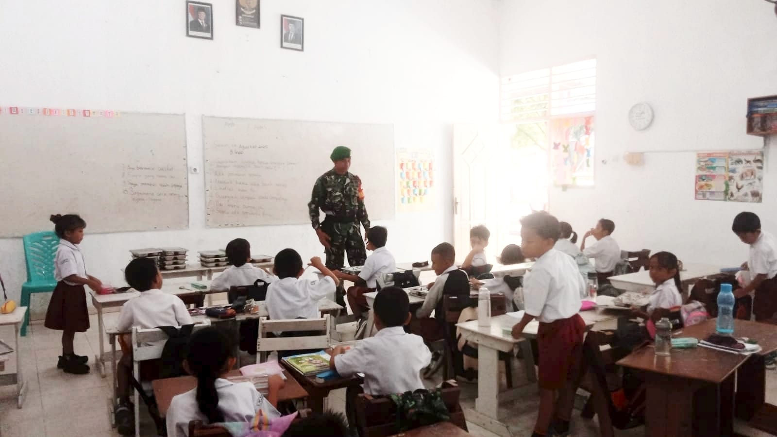 WAINGAPU, || Babinsa Koramil 05/Waingapu, Kodim 1601/Sumba Timur, Sertu M.Ali melakukan pendampingan pembagian program Makan Bergizi Gratis (MBG) di SD Kristen Kasih Agape, Kelurahan Kambajawa, Kecamatan Kota Waingapu, Kabupaten Sumba Timur, Selasa (26/08/2025)