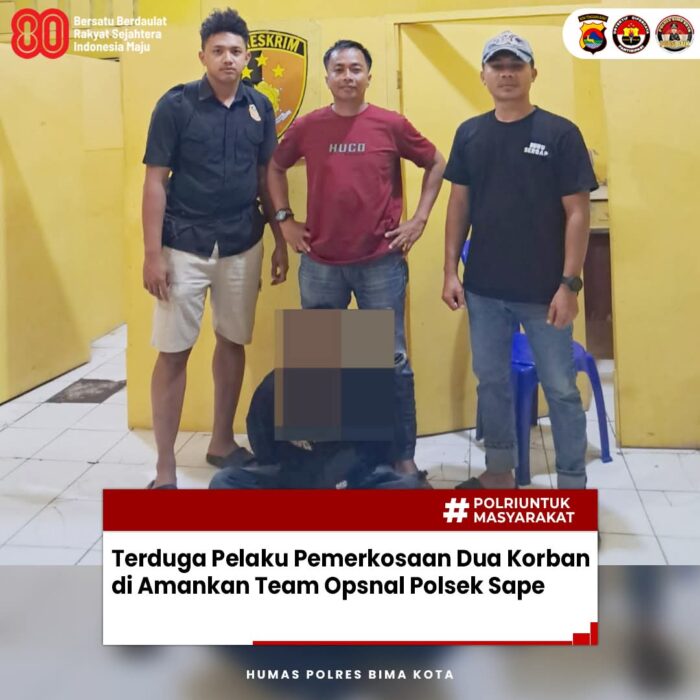 BIMA-NTB || Tim Opsnal Polsek Sape Polres Bima Kota berhasil mengamankan seorang terduga pelaku kasus dugaan tindak pidana pemerkosaan terhadap dua korban, Penangkapan dilakukan pada Minggu (24/8/2025) sekitar pukul 19.30 WITA di Desa Kowo, Kecamatan Sape, Kabupaten Bima.