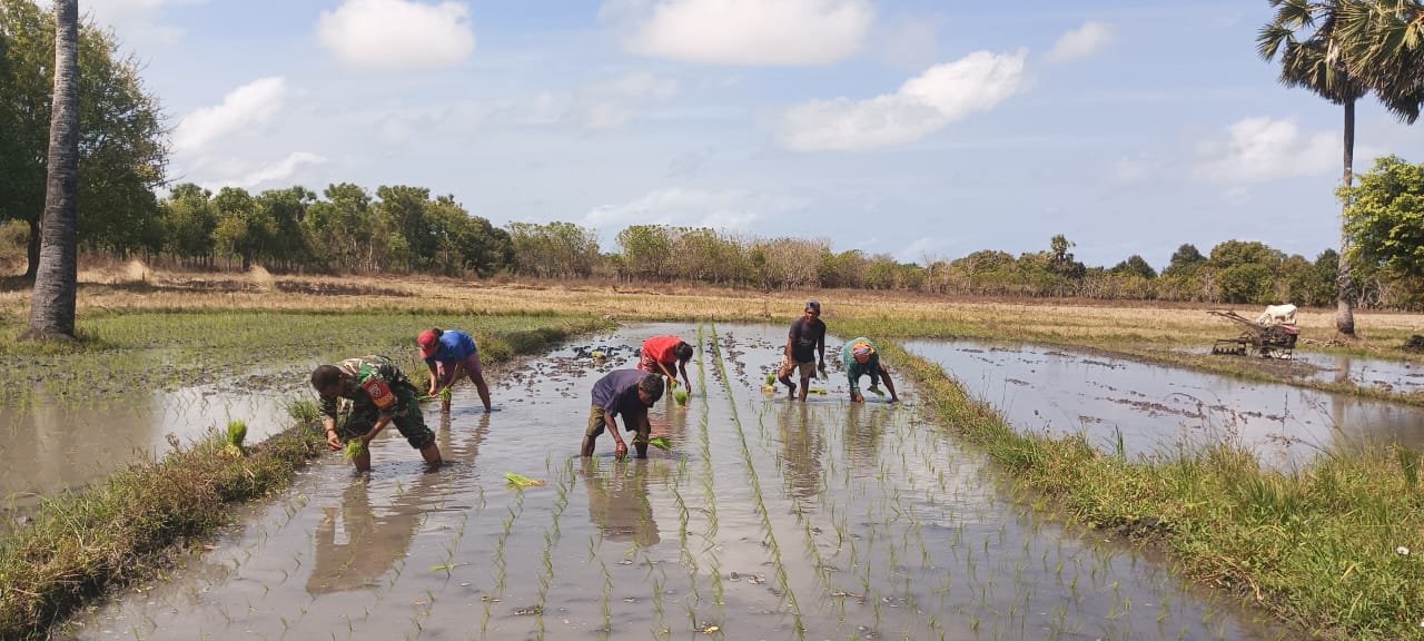 PAHUNGA LODU, || Dalam upaya mendukung program ketahanan pangan, Babinsa Koramil 03/Pahunga Lodu Kodim 1601/Sumba Timur, Serka Daniel Umbu Ndawa, turun langsung ke sawah mendampingi para petani menanam padi di Desa Kaliuda, Kecamatan Pahunga Lodu, Kabupaten Sumba Timur, Kamis (28/08/2025).
