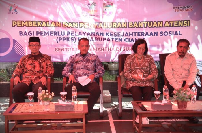 “Atas nama Bupati Ciamis, kami memohon maaf yang sebesar-besarnya. Seyogianya beliau berkenan hadir secara langsung, namun karena adanya agenda kedinasan yang tidak dapat ditinggalkan, beliau menugaskan kami untuk hadir dan menyampaikan apresiasi atas terselenggaranya penyaluran bantuan atensi bagi saudara-saudara penyandang disabilitas di Kabupaten Ciamis,” ujar Dadang.