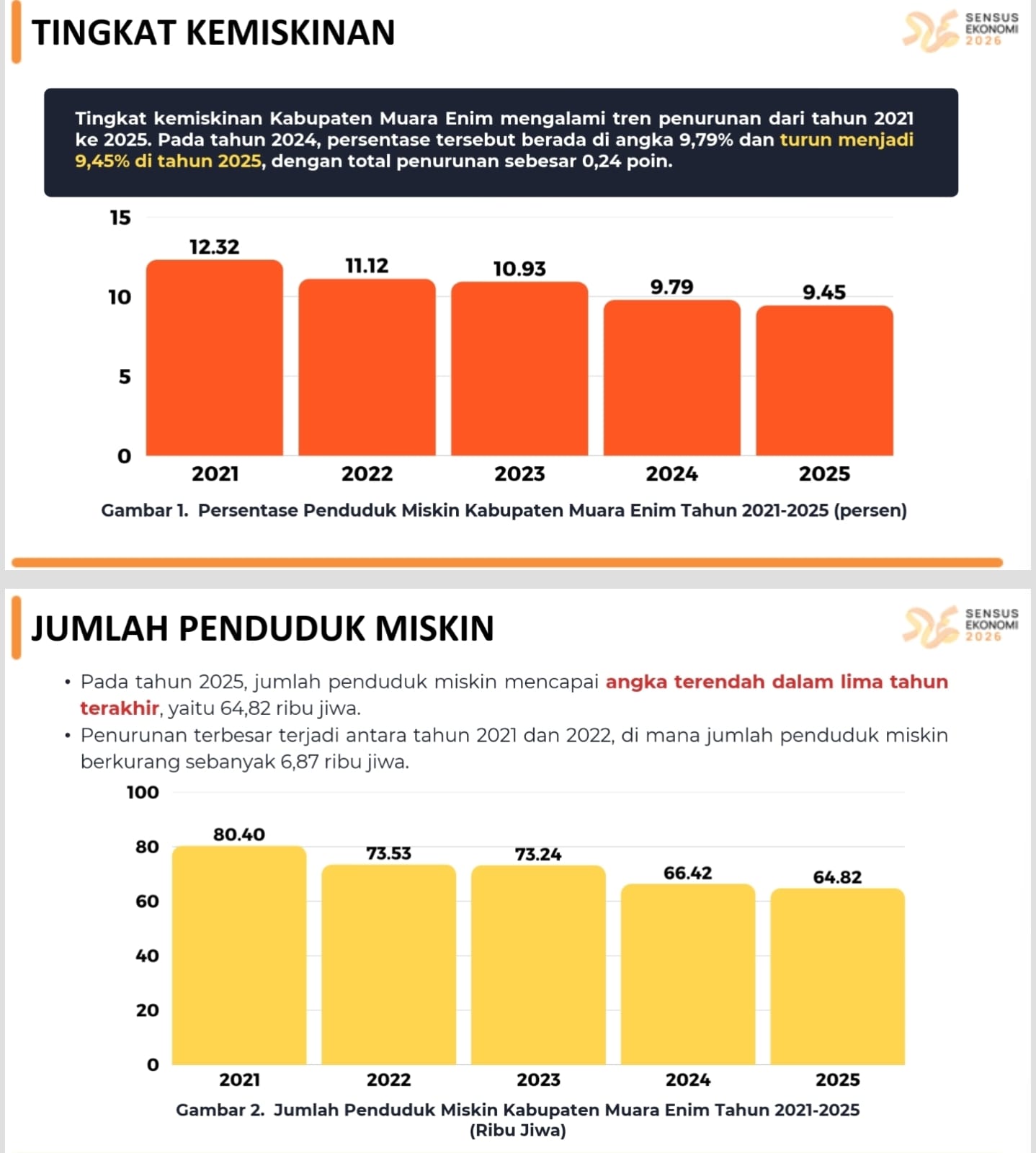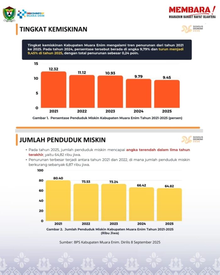 KAB. MUARA ENIM, || Angka kemiskinan di Kabupaten Muara Enim terus menunjukkan tren penurunan. Data terbaru Badan Pusat Statistik (BPS) RI melalui BPS Kabupaten Muara Enim per-September 2025 mencatat persentase penduduk miskin turun menjadi 9,45 persen, atau menurun 0,24 poin dari tahun sebelumnya yang sebesar 9,79 persen.