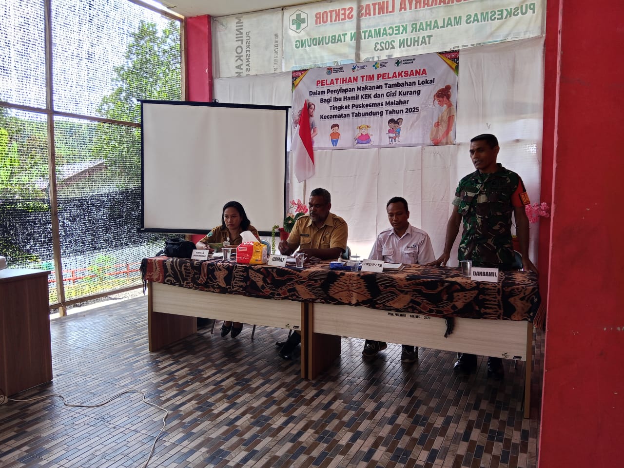 TABUNDUNG, || Babinsa Koramil 04/Tabundung Kodim 1601/Sumba Timur, Kopka Yeni Yupiter Babis, menghadiri kegiatan pelatihan tim pelaksana dalam penyiapan Pemberian Makanan Tambahan (PMT) berbasis pangan lokal bagi ibu hamil dengan Kekurangan Energi Kronis (KEK) dan balita kurang gizi, yang diselenggarakan di Aula Puskesmas Malahar, Desa Billa, Kecamatan Tabundung, Kabupaten Sumba Timur.Senin (10/11/2025).