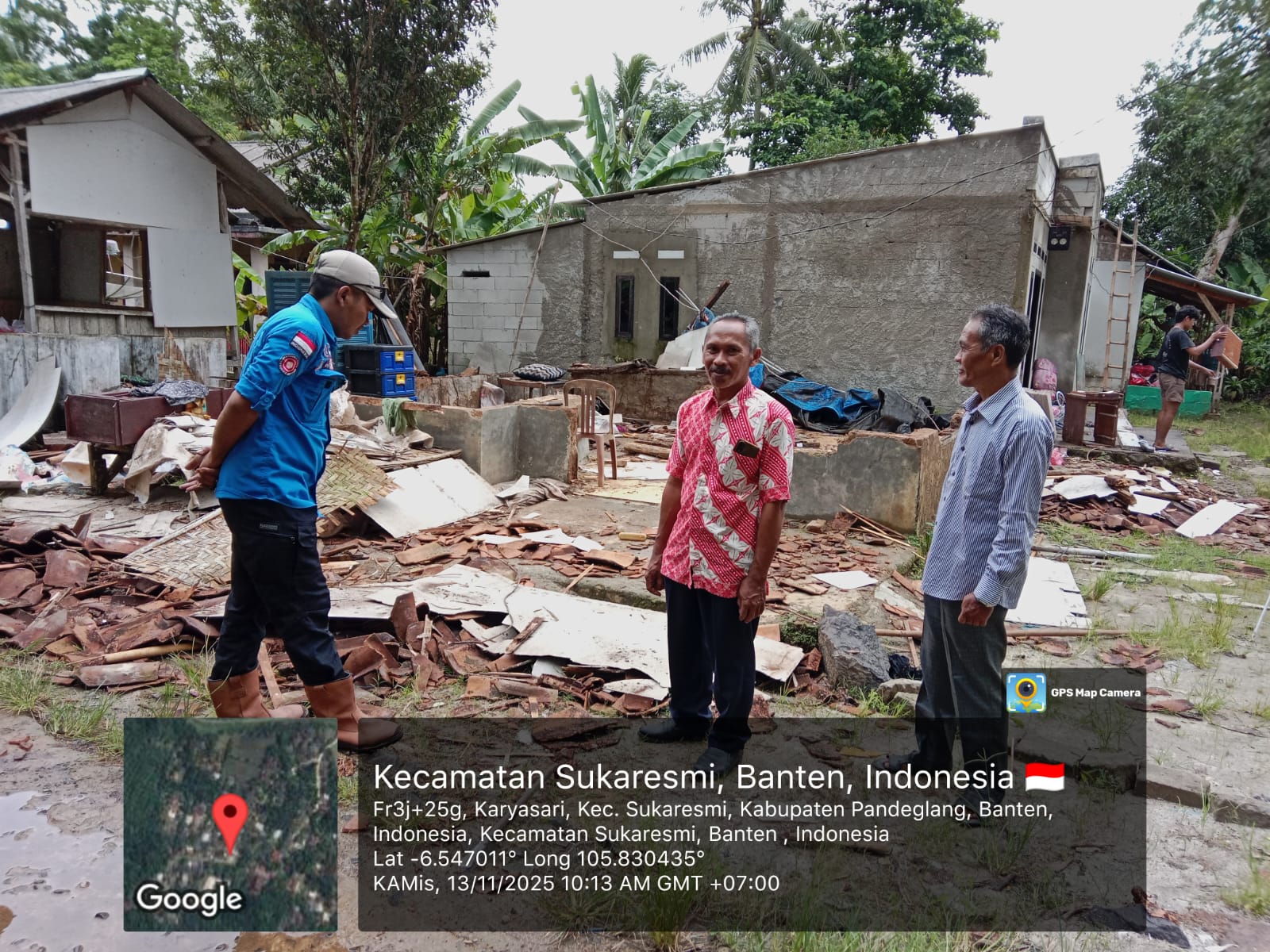 KAB. PANDEGLANG, || Hujan yang disertai angin kencang mengguyur wilayah Kabupaten Pandeglang Provinsi Banten diakhir-akhir menjelang berakhirnya tahun 2025, hal ini membuat rumah milik salah satu warga di Kp Beungbeu Desa Karyasari Kecamatan Sukaresmi ambruk diterjang angin kencang disertai hujan