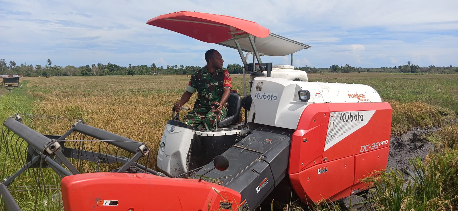 KALIUDA, || Babinsa Koramil 03/Pahunga Lodu Kodim 1601/Sumba Timur, Praka Ferdinan Mukoron melaksanakan kegiatan pendampingan ketahanan pangan dengan membantu warga panen padi menggunakan mesin pemotong padi (Combine Harvester) di lahan pertanian milik Bapak Kristian di Desa Kaliuda, Kecamatan Pahunga Lodu, Kabupaten Sumba Timur, Rabu (19/11/2025).