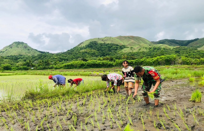 Pratu Hendrik Hapu turun langsung ke lahan bersama para petani untuk membantu proses penanaman sekaligus memberikan semangat agar masyarakat terus mengoptimalkan lahan pertanian.
