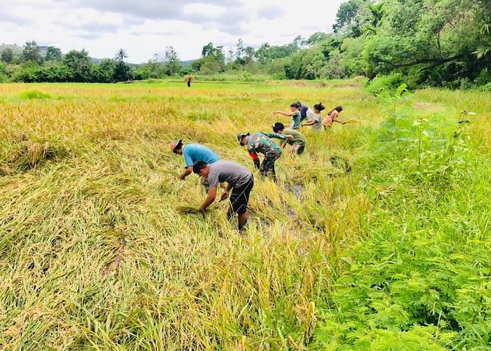NANGGA, || Di hari libur, Babinsa Koramil 06/Karera, Kodim 1601/Sumba Timur, Pratu Hezron Wora tetap turun ke lapangan mendampingi warga dalam kegiatan panen padi di Desa Nangga, Kecamatan Karera, Kabupaten Sumba Timur, Minggu (23/11/2025).