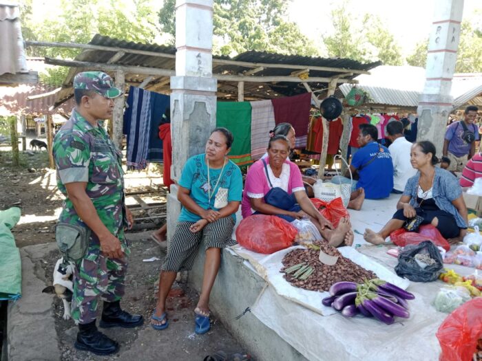Selain memberikan imbauan, Serka Dominggus Lay juga mendengarkan langsung berbagai masukan serta keluhan pedagang terkait kondisi fasilitas dan kebutuhan di pasar.