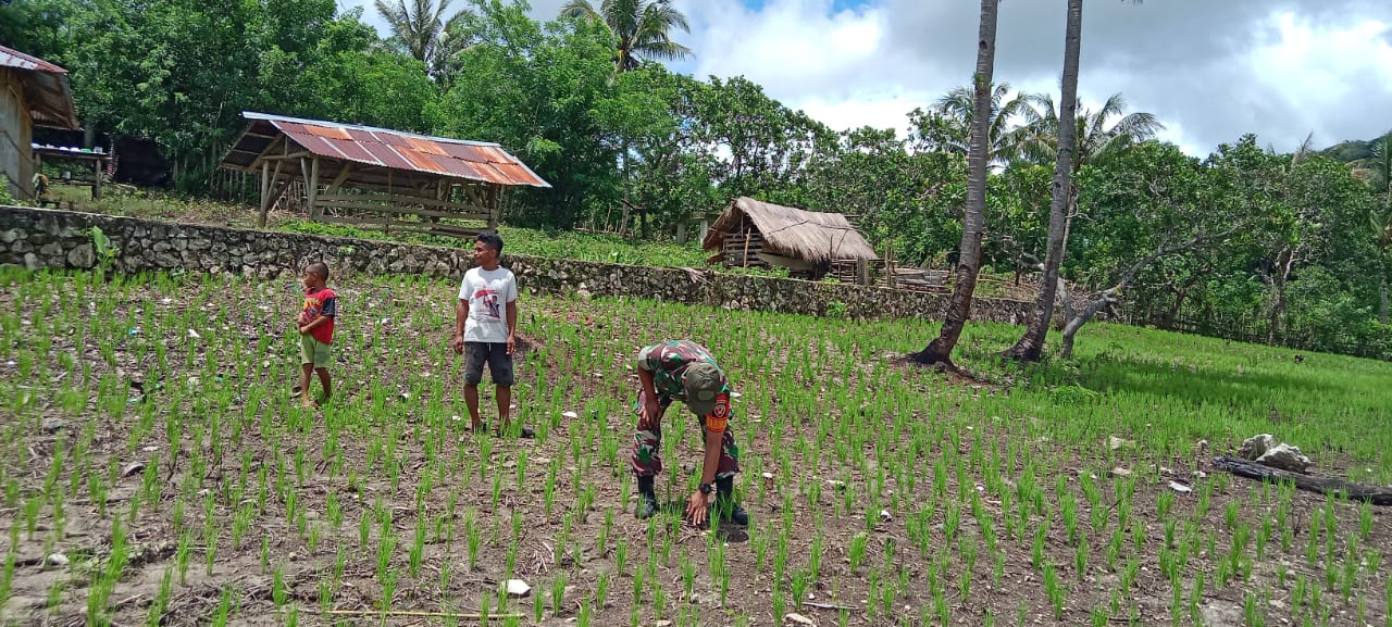 PRAINGKAREHA, || Babinsa Koramil 04/Tabundung Kodim 1601/Sumba Timur, Sertu Ejiman, melaksanakan pendampingan ketahanan pangan (Hanpangan) dengan mengecek kondisi tanaman padi ladang yang berumur satu minggu milik Bapak Ones, warga Desa Praingkareha, Kecamatan Tabundung, Kabupaten Sumba Timur, pada Sabtu (13/12/2025).