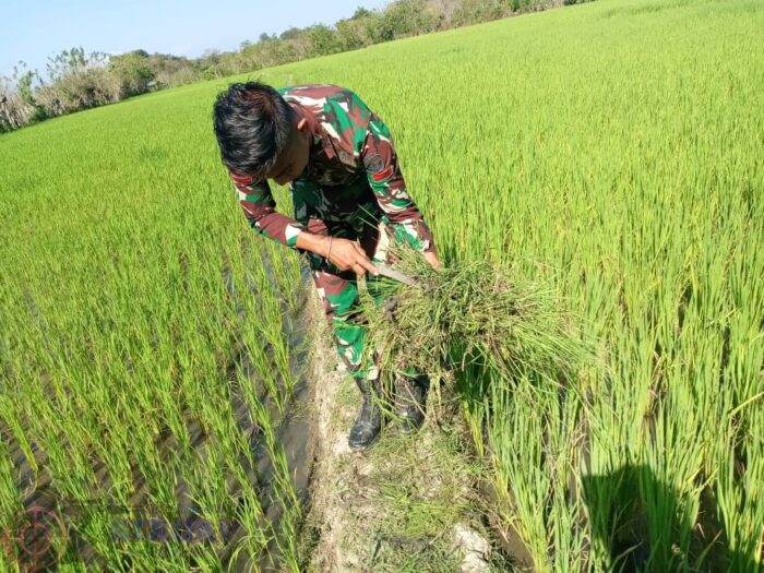 NGGONGI,||Babinsa Koramil 06/Karera Kodim 1601/Sumba Timur. Pratu Aldit Amah, melaksanakan kegiatan pendampingan kepada petani dengan membantu membersihkan rumput di pematang sawah milik warga di Desa Nggongi, Kecamatan Karera, Kabupaten Sumba Timur, pada Minggu (08/02/2026).
