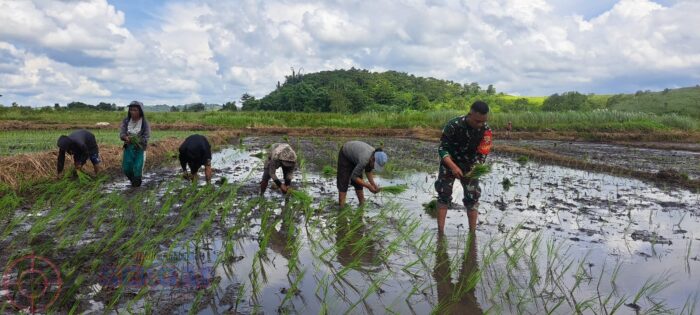Dalam kesempatan itu, Pratu Hendrik Hapu turun langsung ke sawah membantu proses penanaman padi di lahan milik Bapak Umbu.