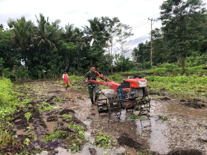 KARERA || Sebagai bentuk kepedulian terhadap kesejahteraan petani, Babinsa Koramil 06/Karera jajaran Kodim 1601/Sumba Timur, Pratu Hezron Woru, turun langsung membantu petani mengolah lahan persawahan di Desa Tandula Jangga, Kecamatan Karera, Kabupaten Sumba Timur, Jumat (20/02/2026).