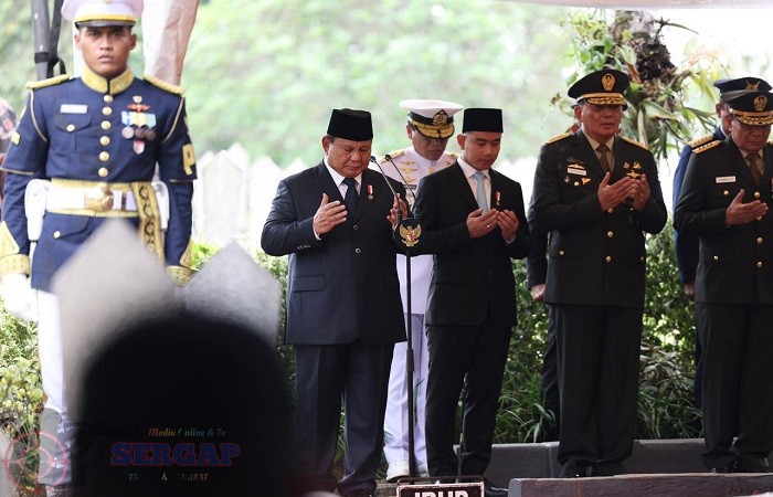 “Sebagai Presiden Republik Indonesia, atas nama negara, bangsa, dan Tentara Nasional Indonesia, saya mempersembahkan ke persada Ibu Pertiwi jiwa raga dan jasa-jasa almarhum,” ujar Prabowo.