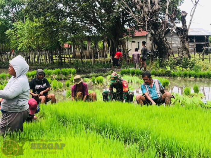 Pratu Hezron Wora terlihat langsung membantu petani mencabut bibit padi yang akan dipindahkan ke lahan tanam.
