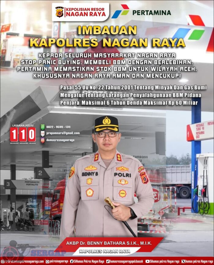 KAB. NAGAN RAYA. || Kapolres Polres Nagan Raya, AKBP Benny Bathara, mengimbau masyarakat di Kabupaten Nagan Raya agar tidak melakukan panic buying atau pembelian bahan bakar minyak (BBM) secara berlebihan karena stok dipastikan aman.