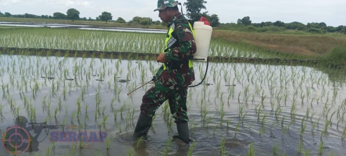 Dalam kegiatan tersebut, Serma Daniel Umbu Ndawa bersama para petani melakukan penyemprotan secara langsung di sejumlah lahan padi yang berpotensi terserang hama dan gulma.