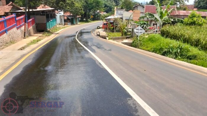 KAB. SUMEDANG // Air terlihat muncul dari permukaan aspal di ruas jalan provinsi Wado–Malangbong, tepatnya di wilayah Desa Cikareo Selatan, Kecamatan Wado, Kabupaten Sumedang, Rabu (14/4/2026). Kondisi tersebut membuat sebagian badan jalan tampak basah dan licin sehingga berpotensi membahayakan para pengguna jalan.