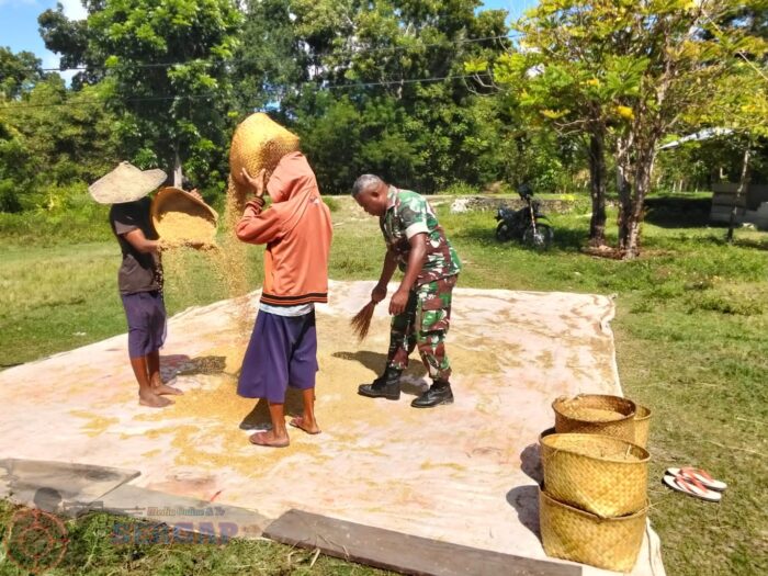PAHUNGA LODU, || Babinsa Koramil 03/Pahunga Lodu Kodim 1601/Sumba Timur, Sertu Yohan S. Saekoko, melaksanakan pendampingan kepada petani dalam proses penjemuran padi hasil panen di Desa Palanggai, Kecamatan Pahunga Lodu, Kabupaten Sumba Timur, Senin (20/4/2026).