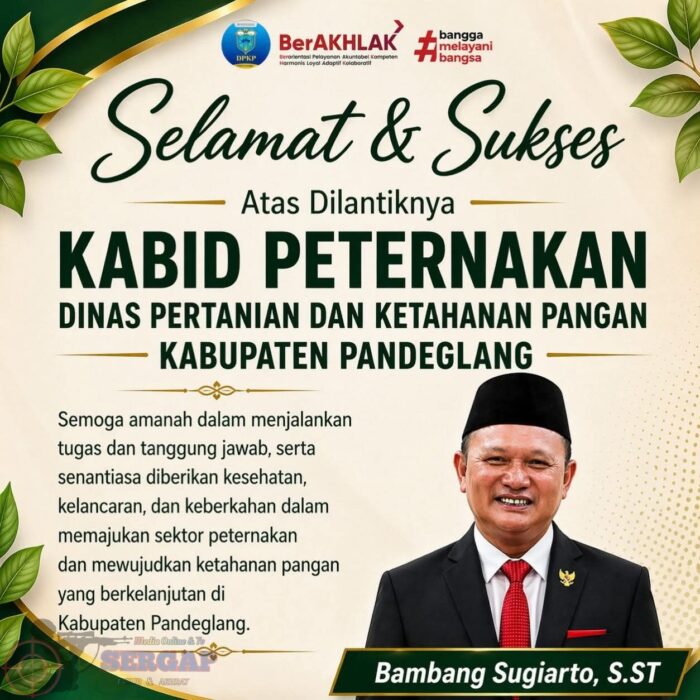 BANTEN, || Ketua Jurnalis Banten Bersatu menyampaikan ucapan selamat dan sukses kepada Bambang Sugiarto, S.ST atas pelantikannya sebagai Kepala Bidang Peternakan dan Kesehatan Hewan. Ucapan tersebut disampaikan sebagai bentuk apresiasi sekaligus harapan terhadap kepemimpinan baru dalam sektor strategis yang berkaitan langsung dengan ketahanan pangan dan kesejahteraan masyarakat.