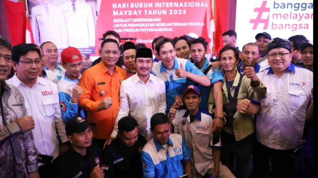 Bupati Bekasi Ade Kuswara Kunang bersama Wakil Bupati Asep Surya Atmaja, Menghadiri peringatan Hari Buruh Internasional Tahun 2025, sekaligus meluncurkan sistem digital pencatatan tenaga kerja pecakpkwt.bekasikab.go.id untuk bagi perusahaan di Kabupaten Bekasi, di Hotel Sahid Jaya, Lippo Cikarang Selatan. Pada Kamis, (01/05/2025).