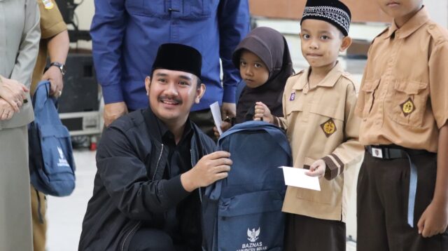 Bupati Bekasi Ade Kuswara Kunang menyerahkan bantuan dana pendidikan dari Baznas Kabupaten Bekasi kepada 2.070 siswa sekolah di acara pendistribusian program Bekasi Cerdas tahap 1 yang digelar Baznas Kabupaten Bekasi di Gedung Swatantra Wibawa Mukti, Cikarang Pusat, pada Selasa (6/5/2025).
